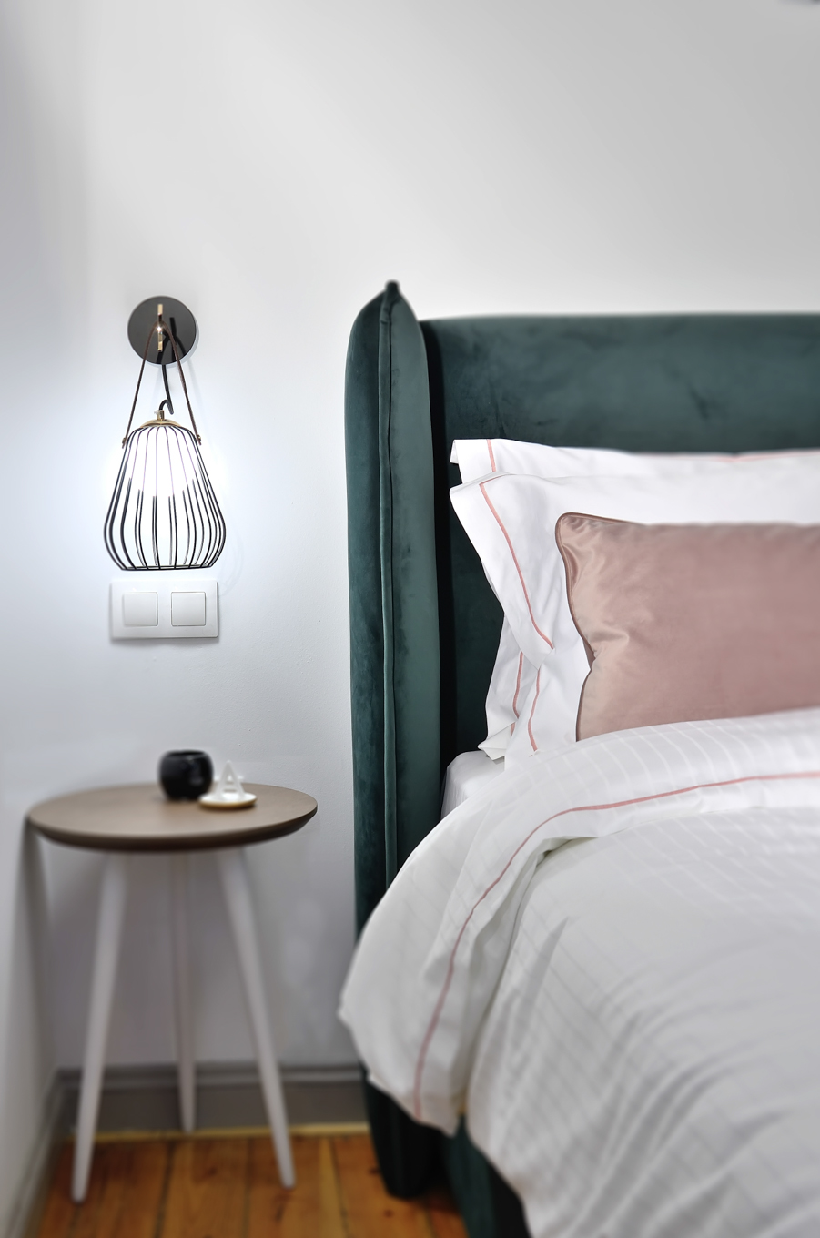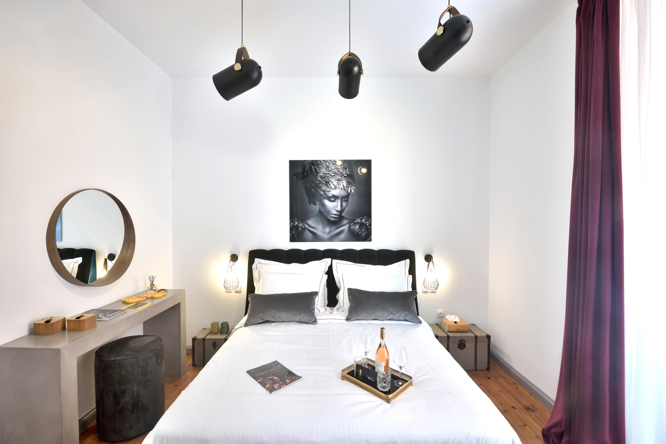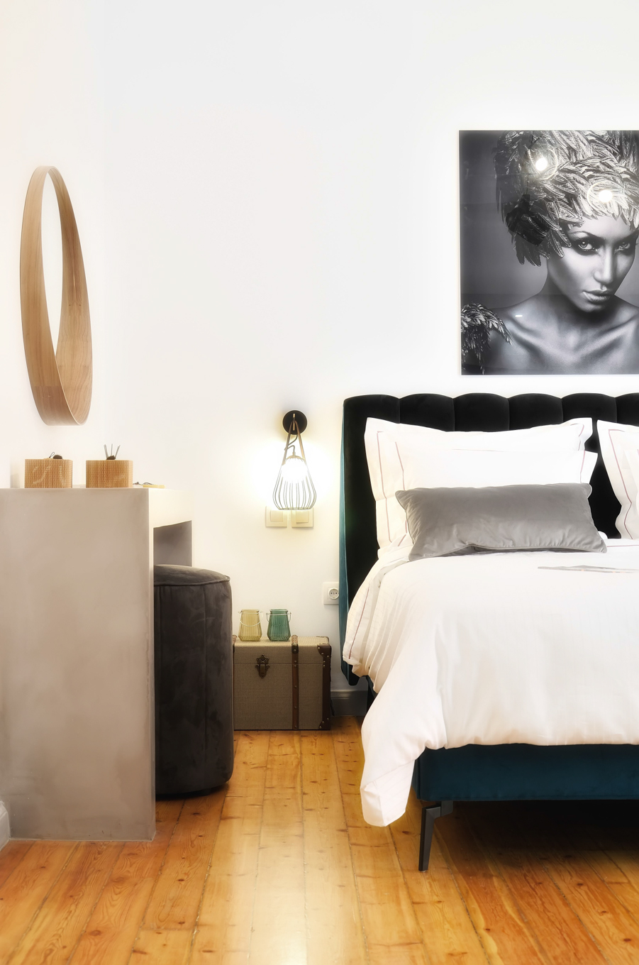 Περιλαμβάνει ένα κρεβάτι μεγέθους King-size με εκλεκτά βαμβακερά σκεπάσματα.