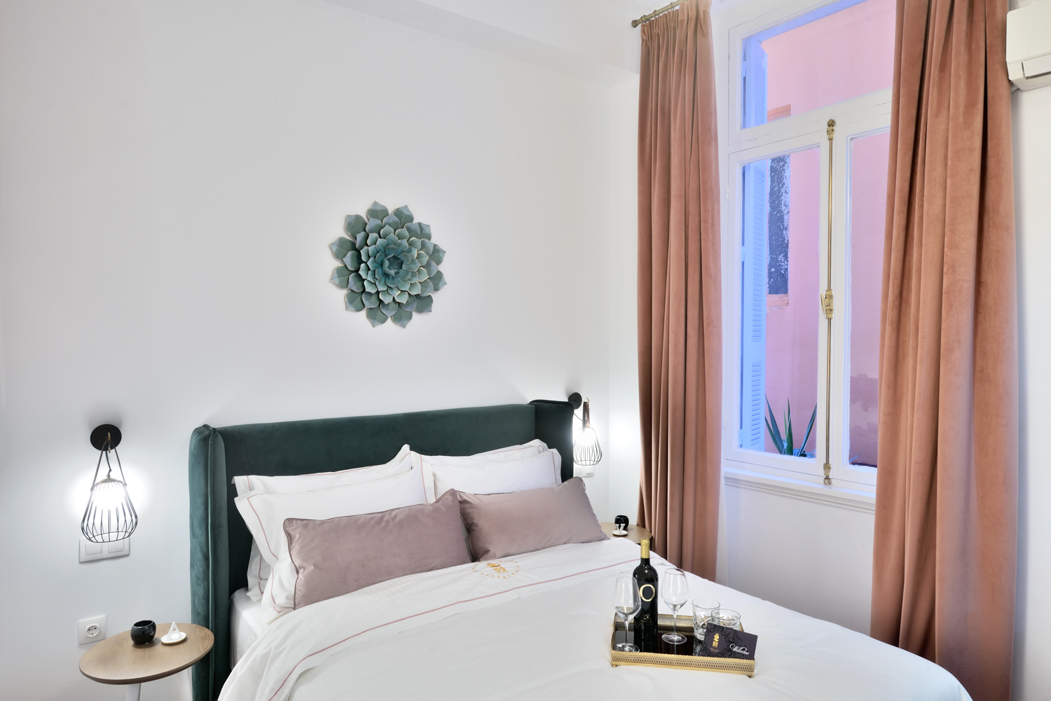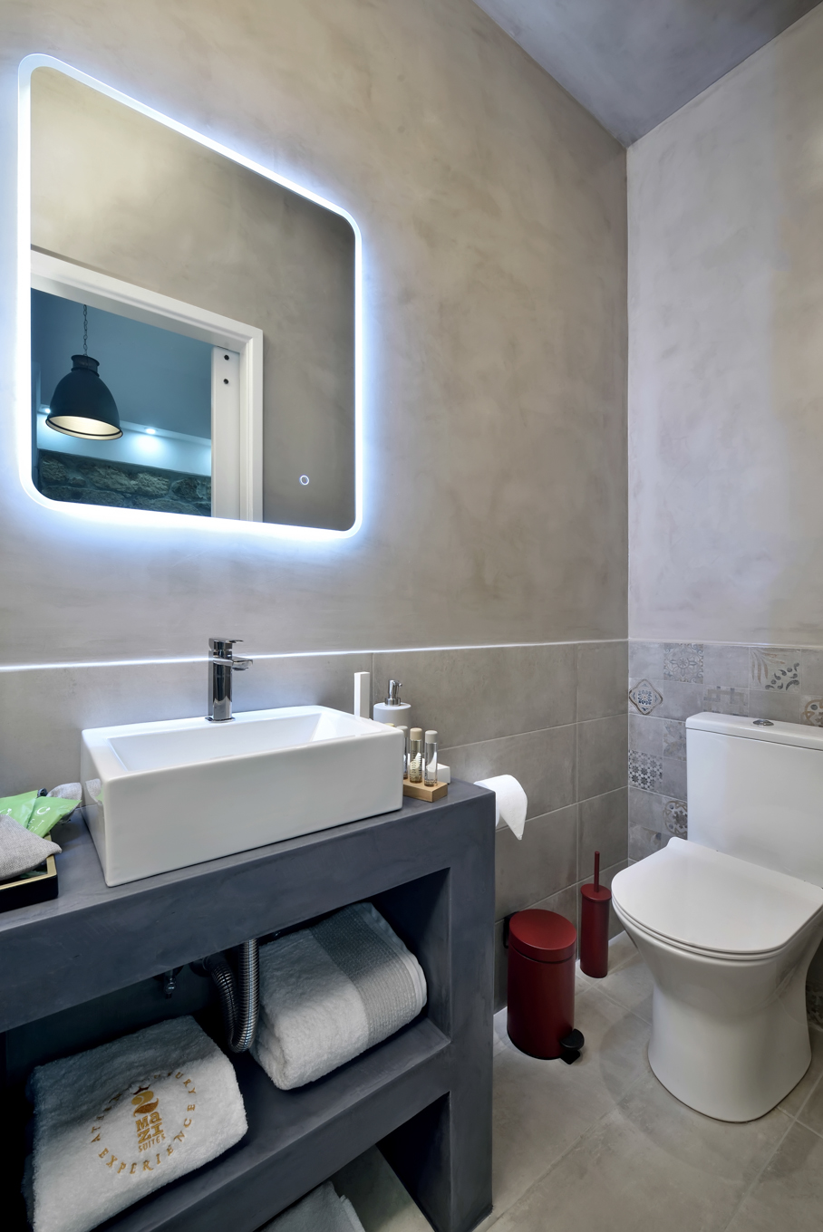 Μοντέρνα επιπλωμένη και εξοπλισμένη με πολυτελείς παροχές, η σουίτα Theseus βλέπει στην καταπράσινη αυλή του εστιατορίου 2mazi.