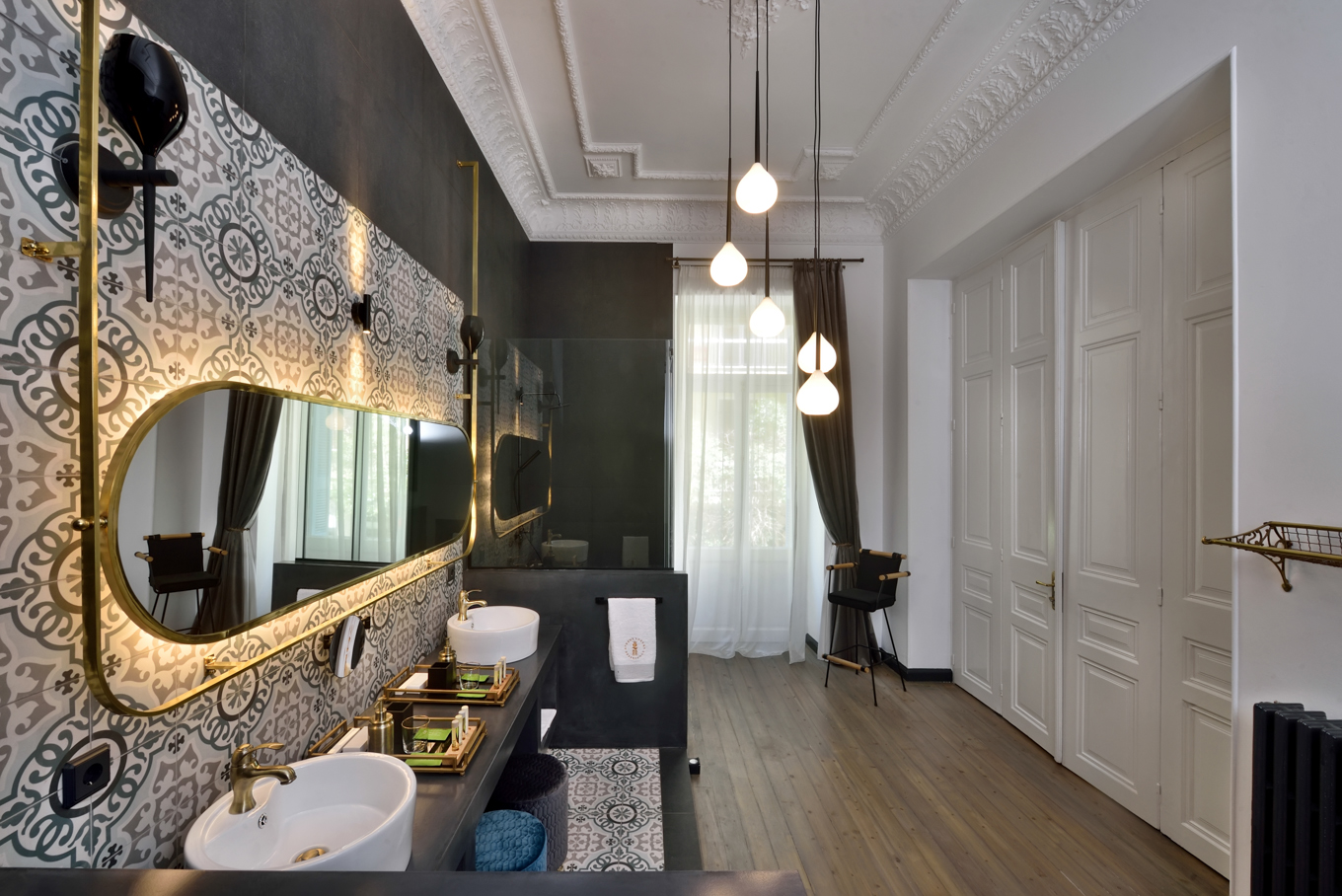 Τα ψηλά ταβάνια, τα αυθεντικά γύψινα και τα μεγάλα παράθυρα, μας υποβάλλουν σε μια ατμόσφαιρα κλασσικής πολυτέλειας.
